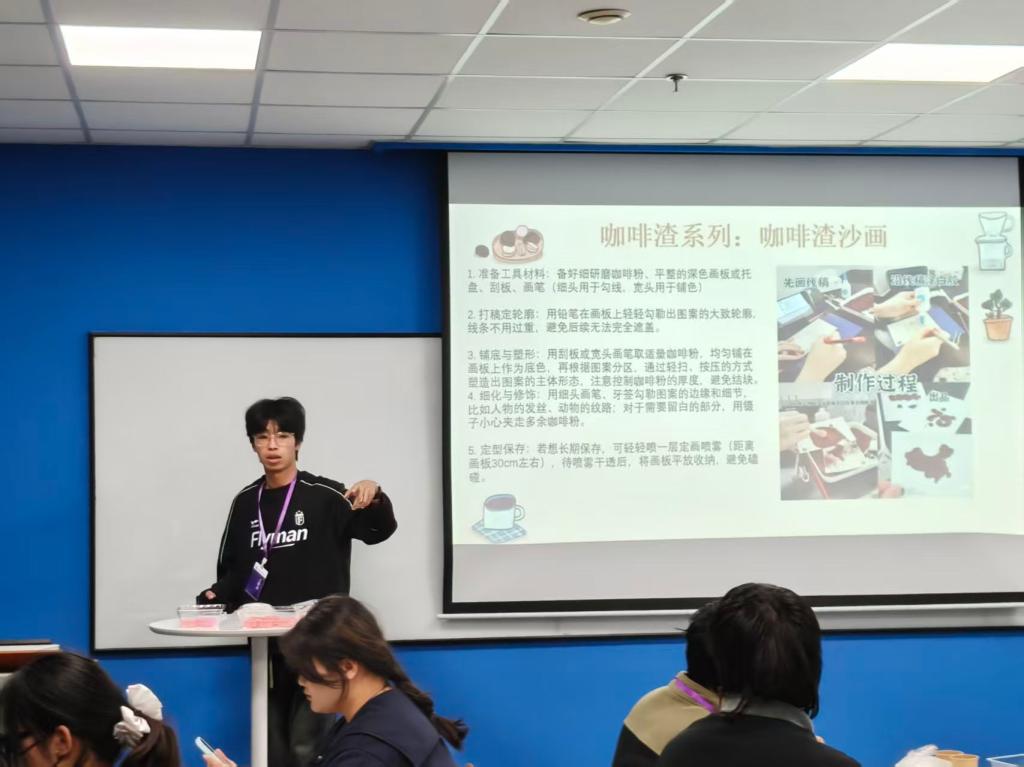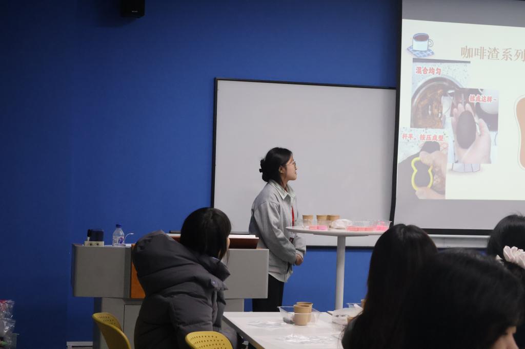 活动伊始,马筱晗以咖啡渣“重生之旅”巧妙开场,深入浅出地阐释了废弃物资源化利用所蕴含的深远意义,犹如一颗智慧的种子,播撒在每一位成员的心田,激励着他们学会从日常生活中挖掘那些潜藏的创新灵感。