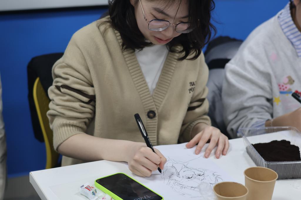 随后,果天航的精彩演示将活动推向了另一个高潮。同学们以干燥的咖啡渣为神奇的颜料,充分发挥自己的想象力和创造力,通过撒、勾、抹等细腻而富有变化的手法,在洁白的画纸上尽情挥洒,一幅幅富有独特纹理的沙画作品跃然纸上,展现出艺术与环保完美融合的魅力。