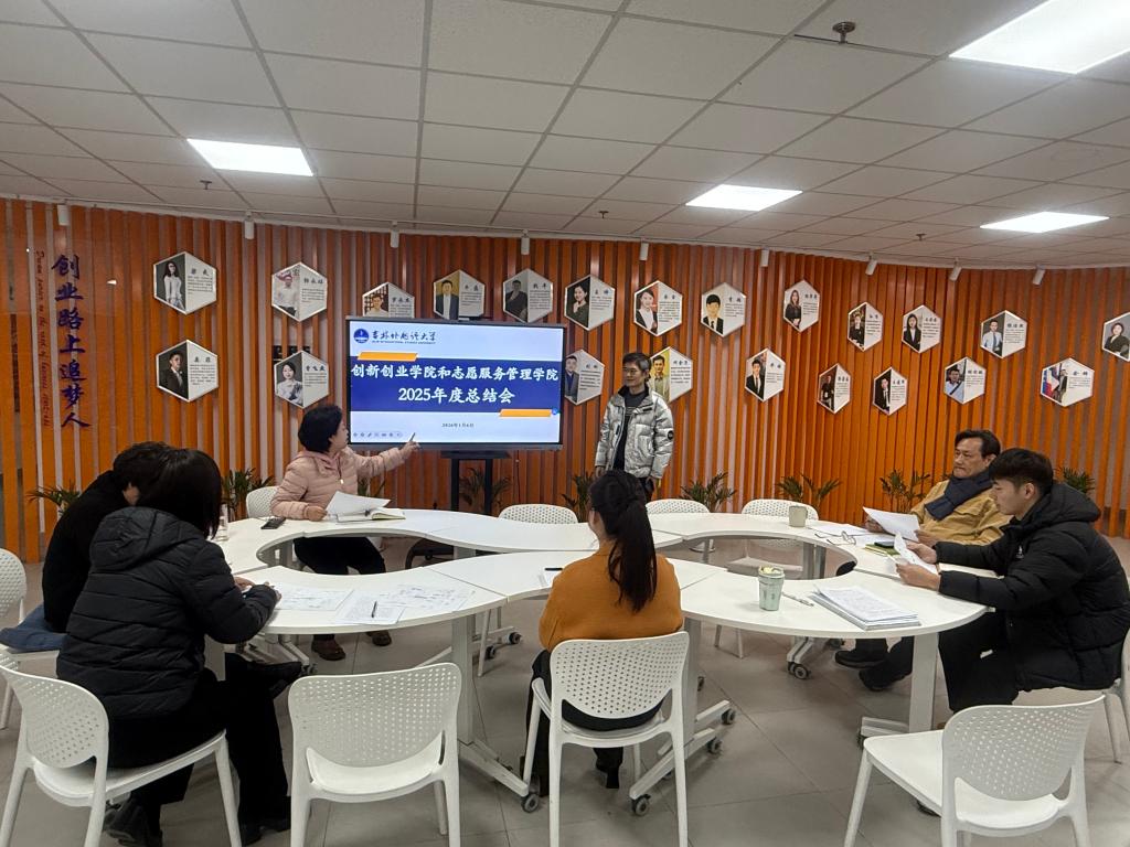 2026年1月6日,创新创业学院与志愿服务管理学院召开2025年度期末工作总结会,会议由创新创业学院和志愿服务管理学院院长张俊姝主持,两学院全体教师参加会议并进行年度工作汇报。会议全面回顾了本年度在教学改革、科研产出、行政管理及社会服务等方面取得的成果,总结经验、查找不足,并对2026年度重点工作进行了部署。